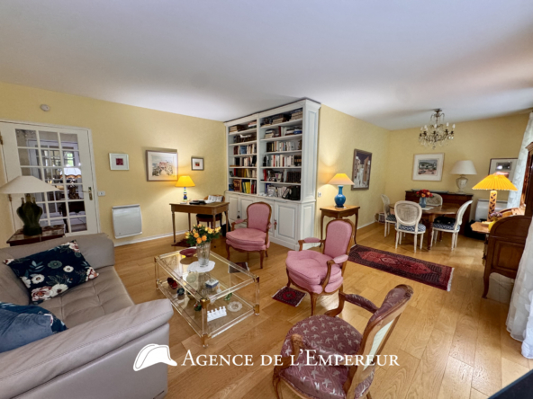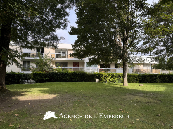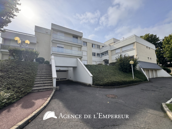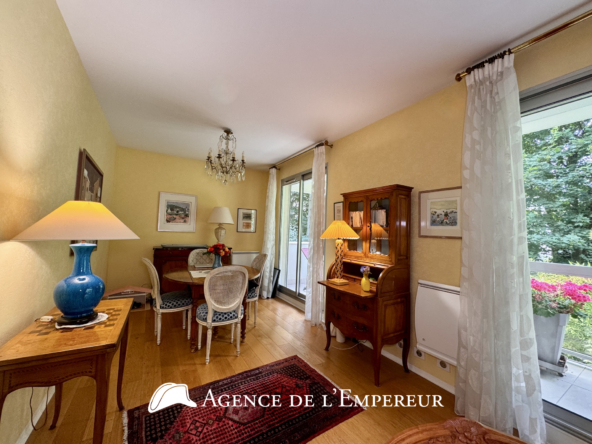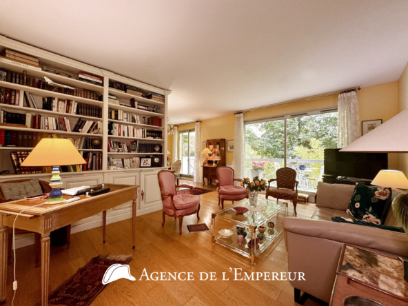 L’Agence de l’Empereur vous présente ce chaleureux appartement de 82,40 m2, situé au 1er étage sur 2 de la recherchée résidence L’Aiglon. Il se compose ainsi : une entrée avec placard et commodités, un double séjour de 30,30 m2 orienté Ouest donnant accès à un premier balcon de 12,80 m2, une cuisine de 11,70 m2 comprenant un espace dînatoire, bien aménagée, bénéficiant également d’un accès au balcon. Pour la partie nuit : deux chambres de 11 m2 avec placard et accès au second balcon, dont l’une dispose d’une salle de bains attenante. Une deuxième pièce d’eau comprend douche et commodités. Il sera possible de créer une troisième chambre en cloisonnant la salle à manger. Vous apprécierez les vues verdoyantes depuis chaque pièce, l’orientation principale Sud et Ouest, et l’environnement de cette résidence située à deux pas du Parc de Bois Préau et à 6 minutes à pied du centre-ville. Une cave de 10 m2 complète le bien ainsi qu’un grand garage de 31,80 m2, permettant de garer deux voitures en enfilade et de disposer d’un espace bricolage/rangement. Les charges de 250 €/mois incluent l’eau froide et l’entretien général de la copropriété. Chauffage individuel électrique, double vitrage avec volets roulants, élégant parquet massif dans toutes les pièces sèches. Immeuble familial de bon standing, construit en 1984, ayant bénéficié d’un ravalement récent (2019) et jouissant d’une très bonne réputation.