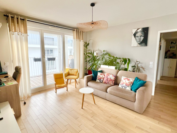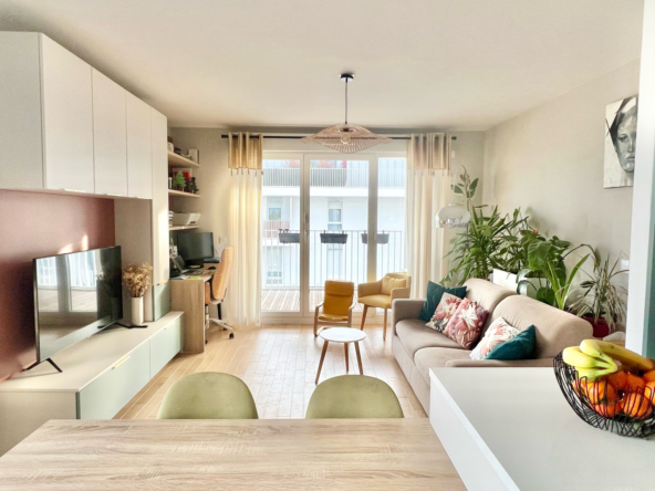 Cet appartement, parfaitement agencé, se compose d’une entrée, d’un séjour avec cuisine ouverte aménagée de 24 m2 s’ouvrant directement sur le balcon, de deux chambres, d’une salle de bains ainsi que des wc séparés avec la possibilité d’y aménager une salle d’eau. Parquet massif dans toutes les pièces sèches, double vitrage avec volets roulants électriques.