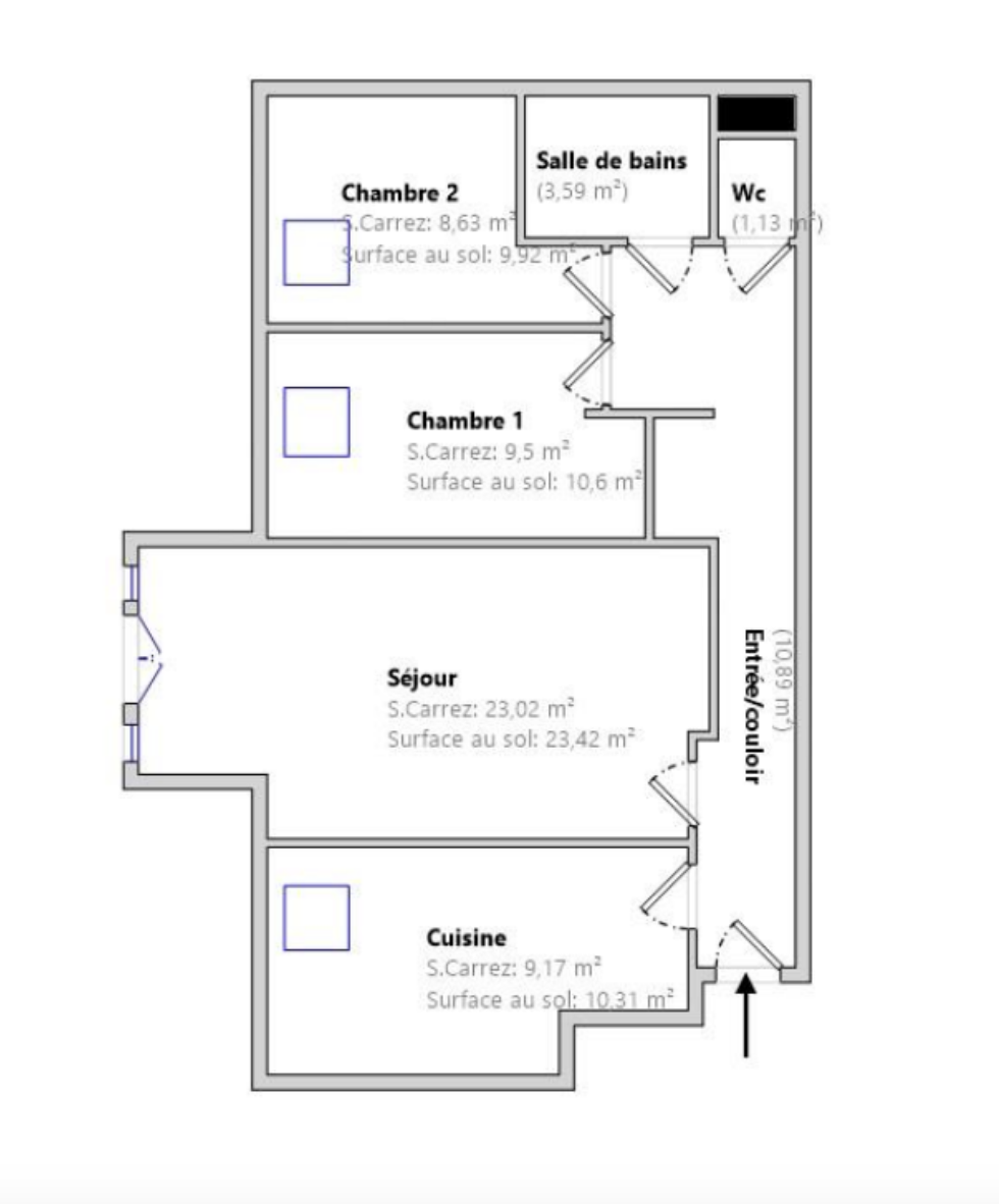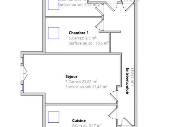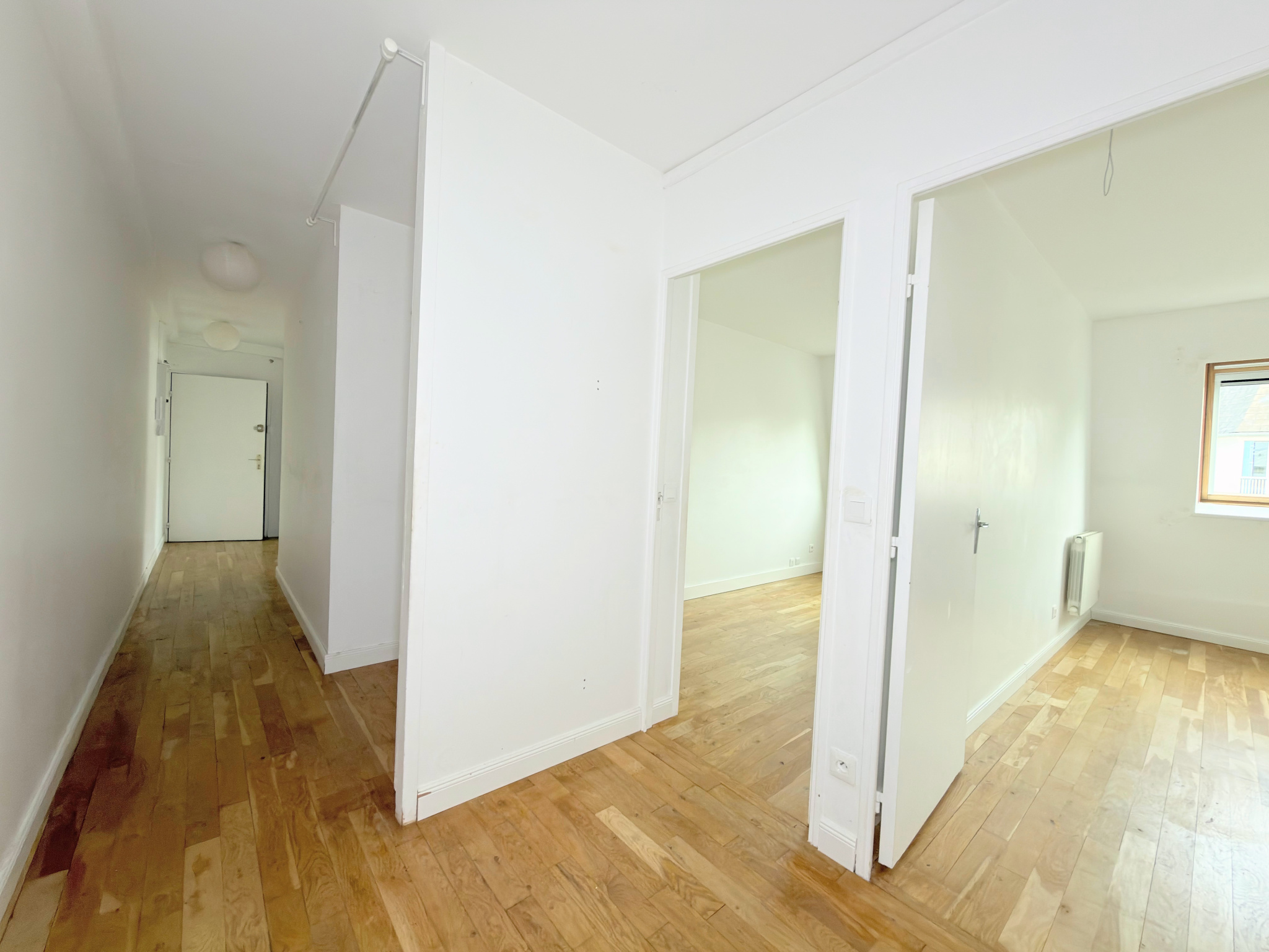 Il se compose ainsi : une entrée/dégagement avec placard, un séjour de 23 m2 orienté Est pouvant s’ouvrir sur la cuisine de 10 m2 et le dégagement, créant un potentiel de pièce de vie d’environ 40 m2. Deux chambres de 9 m2 et 10,5 m2, une salle de bains et des toilettes séparées.